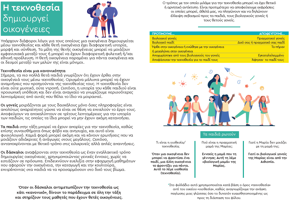 «Η τεκνοθεσία στο σχολικό περιβάλλον» παρουσιάζει ένα πραγματικό και χρήσιμο τρόπο κατανόησης της τεκνοθεσίας και συζήτησης για το θέμα της τεκνοθεσίας στην τάξη. Περιέχει ένα πολύ βασικό λεξιλόγιο που μπορεί να βοηθήσει κάποιον να αναφέρεται στην τεκνοθεσία, τη διαδικασία και τους ανθρώπους που εμπλέκονται. Προσφέρει επίσης τεκμηριωμένες απαντήσεις σε τρεις κοινές ερωτήσεις που κάνουν τα παιδιά για την τεκνοθεσία.